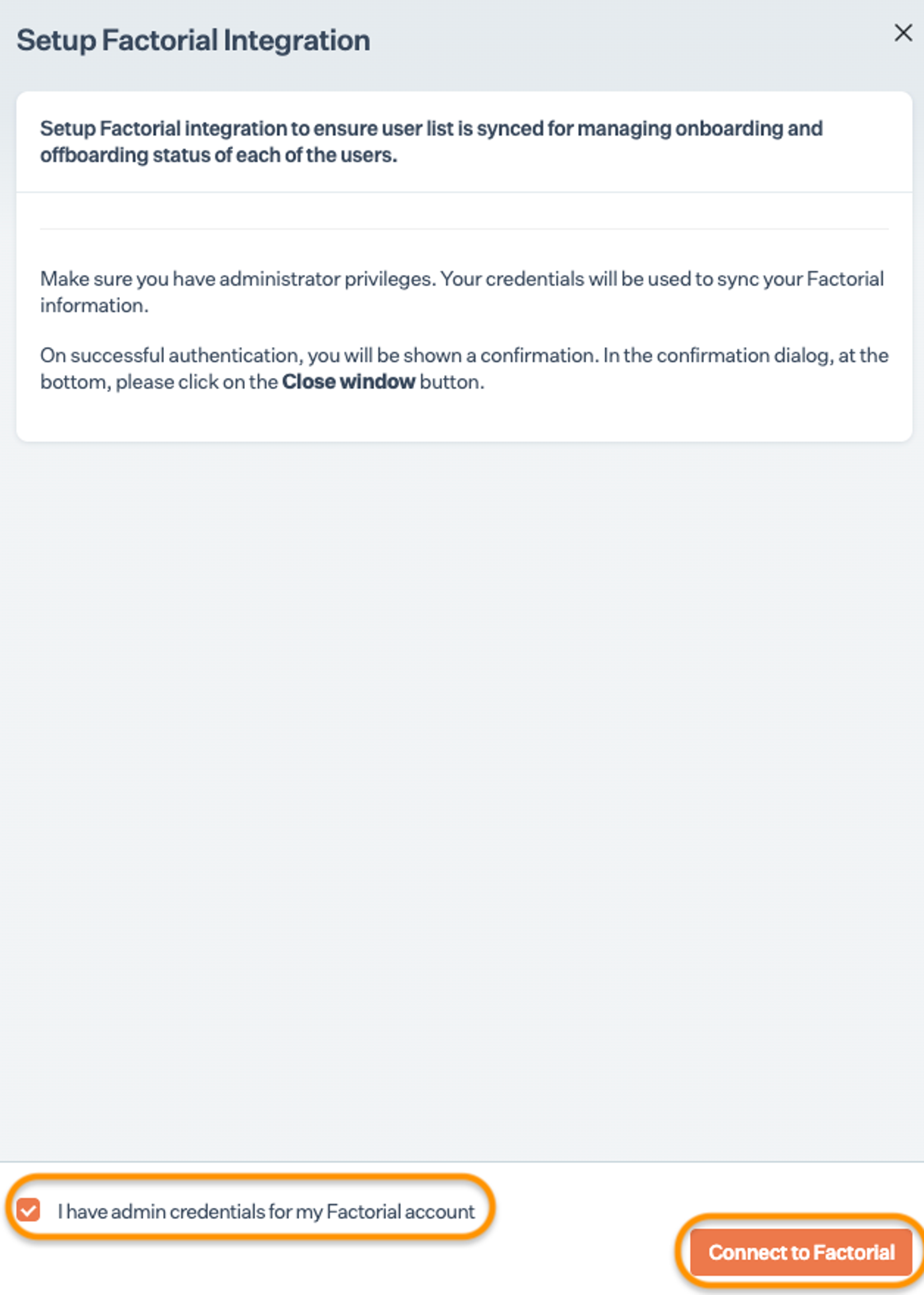 Ensure you have “Admin” access on the Factorial account you are integrating.