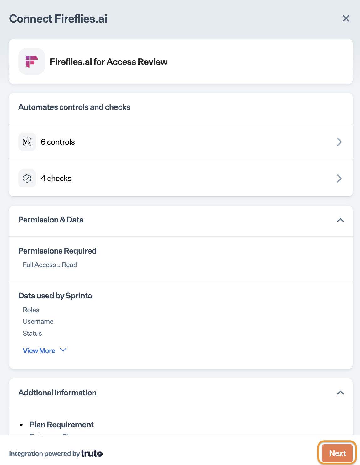 After completing Step 3, allow 15 to 20 minutes for Sprinto to finish the data syncing process. Sprinto may take up to 24 hours to evaluate the synced data and activate relevant Sprinto checks. If needed, go to Data Library > Access > Critical System to check for pending tasks next to Fireflies.ai.