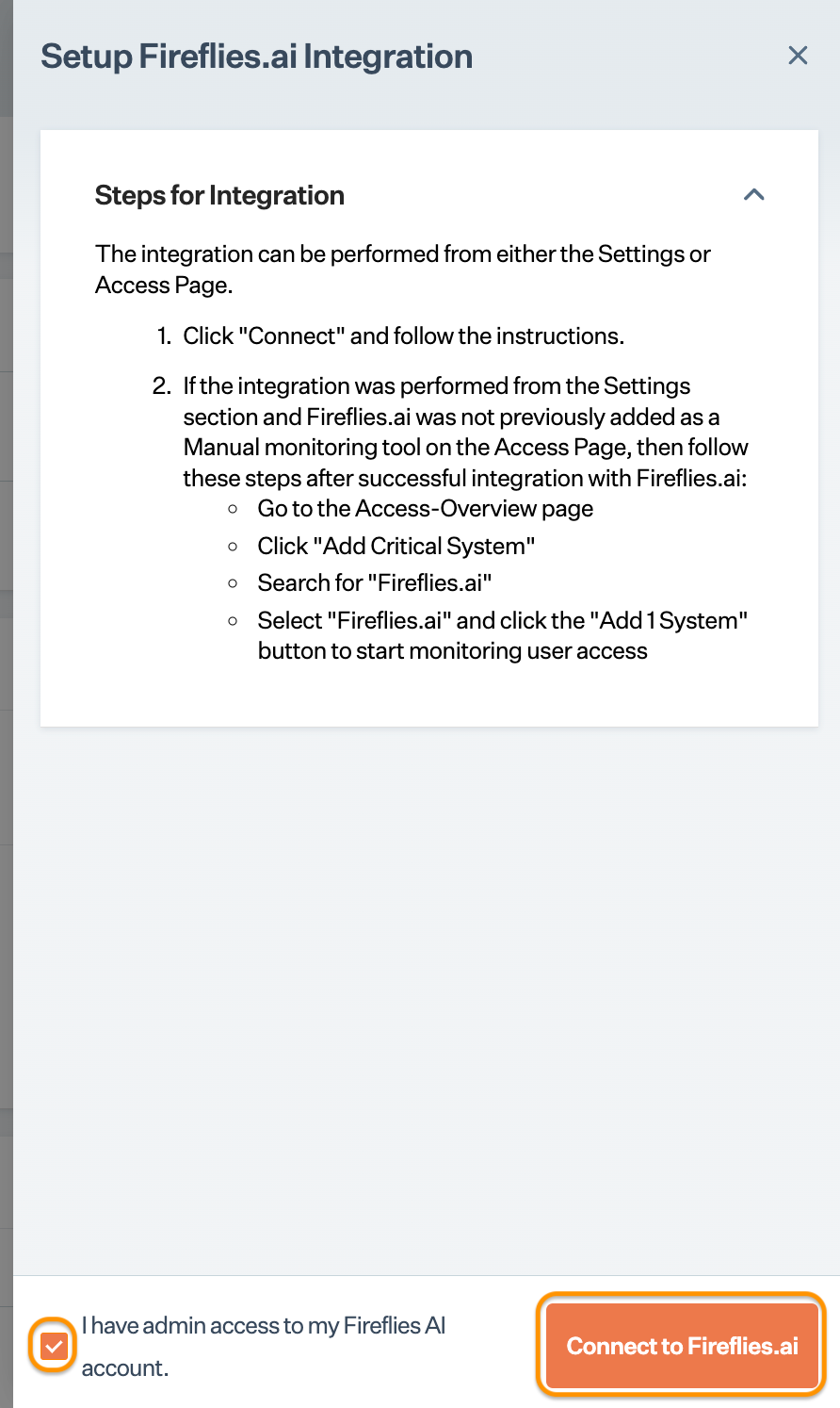 On Integration page, select the acknowledgement checkbox, then click Connect to Fireflies.ai. Note: Ensure you have a pop-up window enabled on your browser.