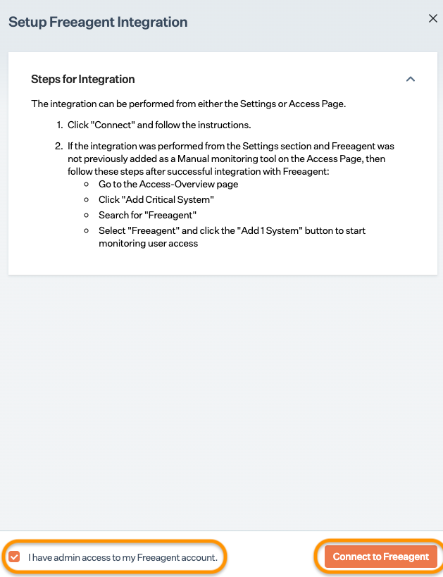 Ensure you have “Admin” access on the FreeAgent account you want to integrate.
