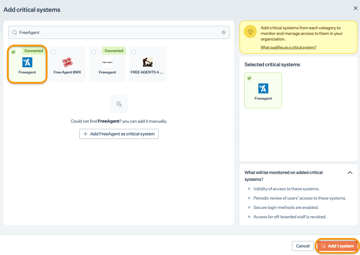 On Add Critical Systems page, select FreeAgent and click Add System.