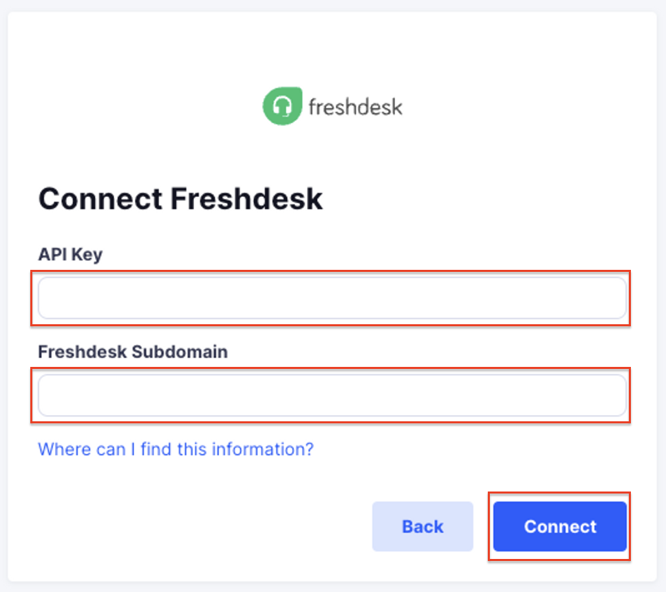 4. On Freshdesk authentication page, enter the API key and Freshdesk Subdomain in the respective fields and click Connect.\