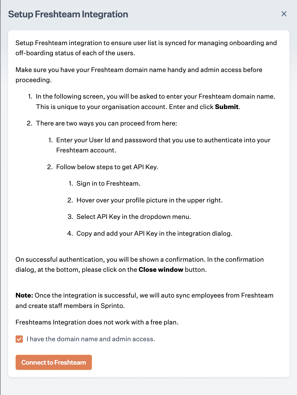 Step 5: Select the checkbox I have the domain name and admin access and click on Connect to Freshteam.