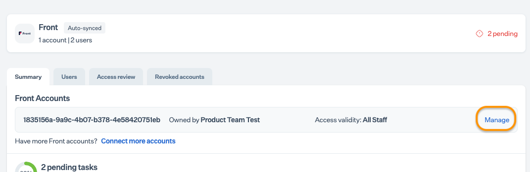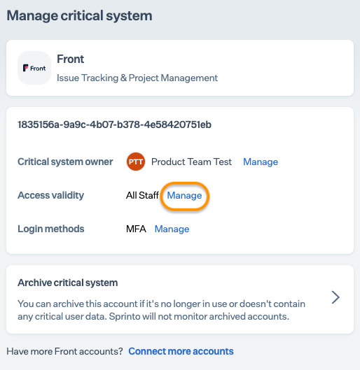 Front is integrated and configured as a critical system; Sprinto will sync user account data from Front and compute users’ access validity. Sprinto will also activate the Sprinto check against any staff member who does not have valid access. Wait until Sprinto finishes the data syncing process.