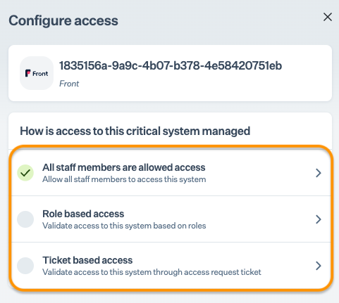 Select Front from the critical system library, and click Add system. Note: “Connected” is highlighted next to the critical system if the system is integrated successfully from the previous step.