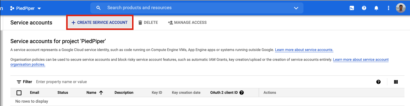 Step 3: On the resulting page, click on "**+ Create a service account.**