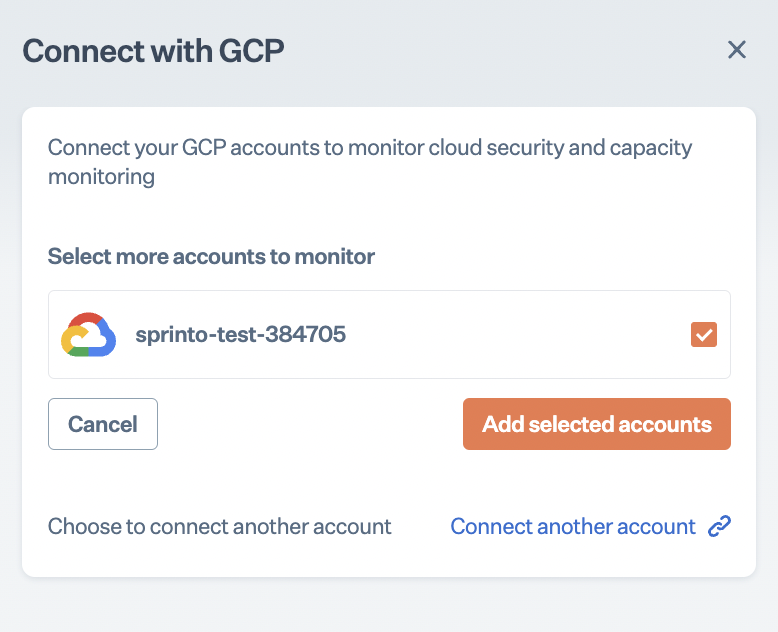 Step 15: Click on Add Now next to GCP and select the accounts you would like to sync with Sprinto and click on Add selected accounts which will complete the integration.<br>
