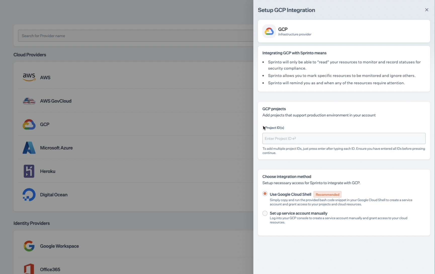 Congratulations! Sprinto is now connected to your GCP resources, and within the next 24 hours, you'll start receiving data and insights on the Sprinto platform. If you have any questions or concerns during the integration process, don't hesitate to reach out to your CSM for help. You may also contact Sprinto Support.