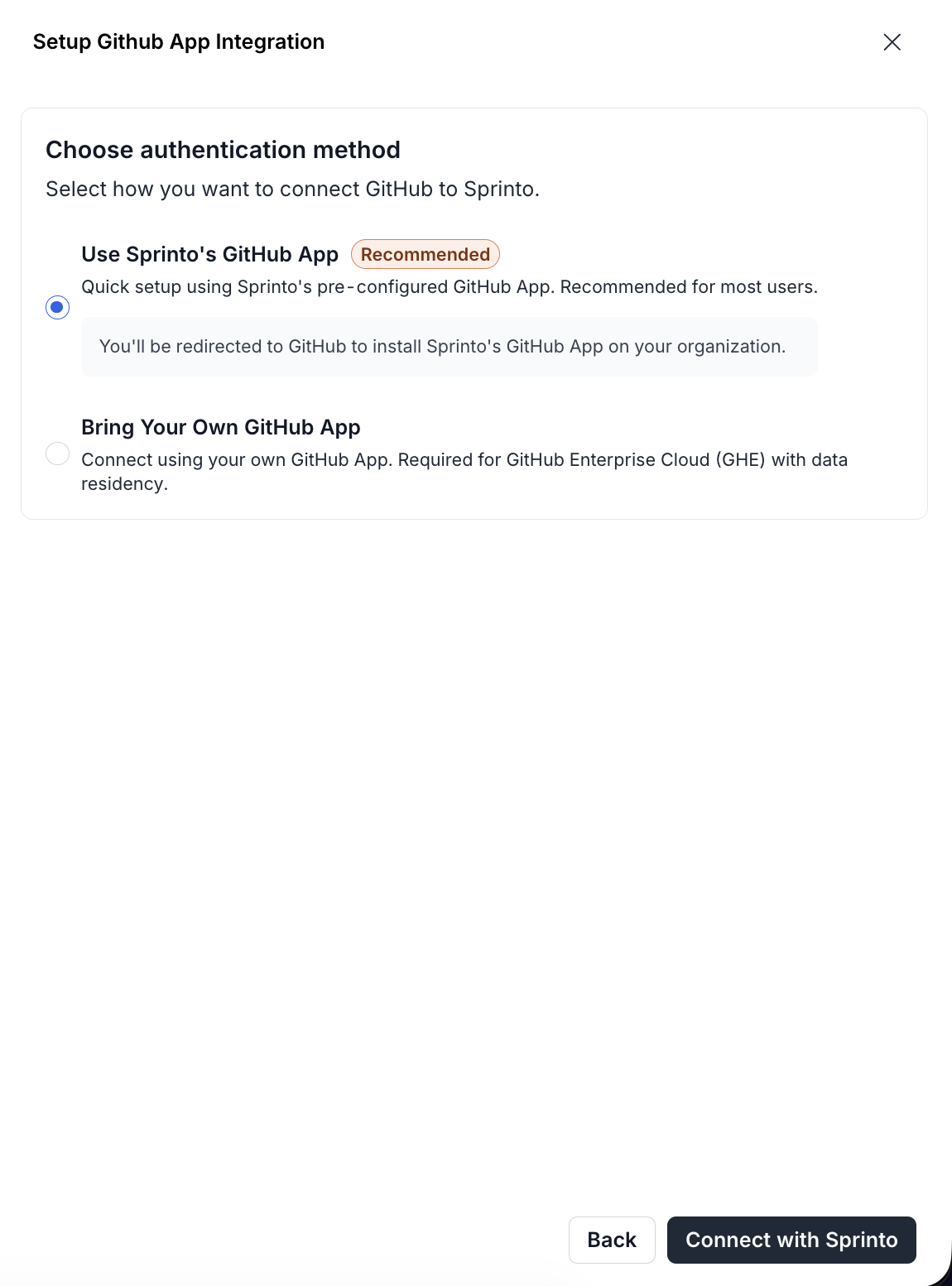 * **Sprinto GitHub App (recommended)** — Quick setup using Sprinto’s pre-configured app