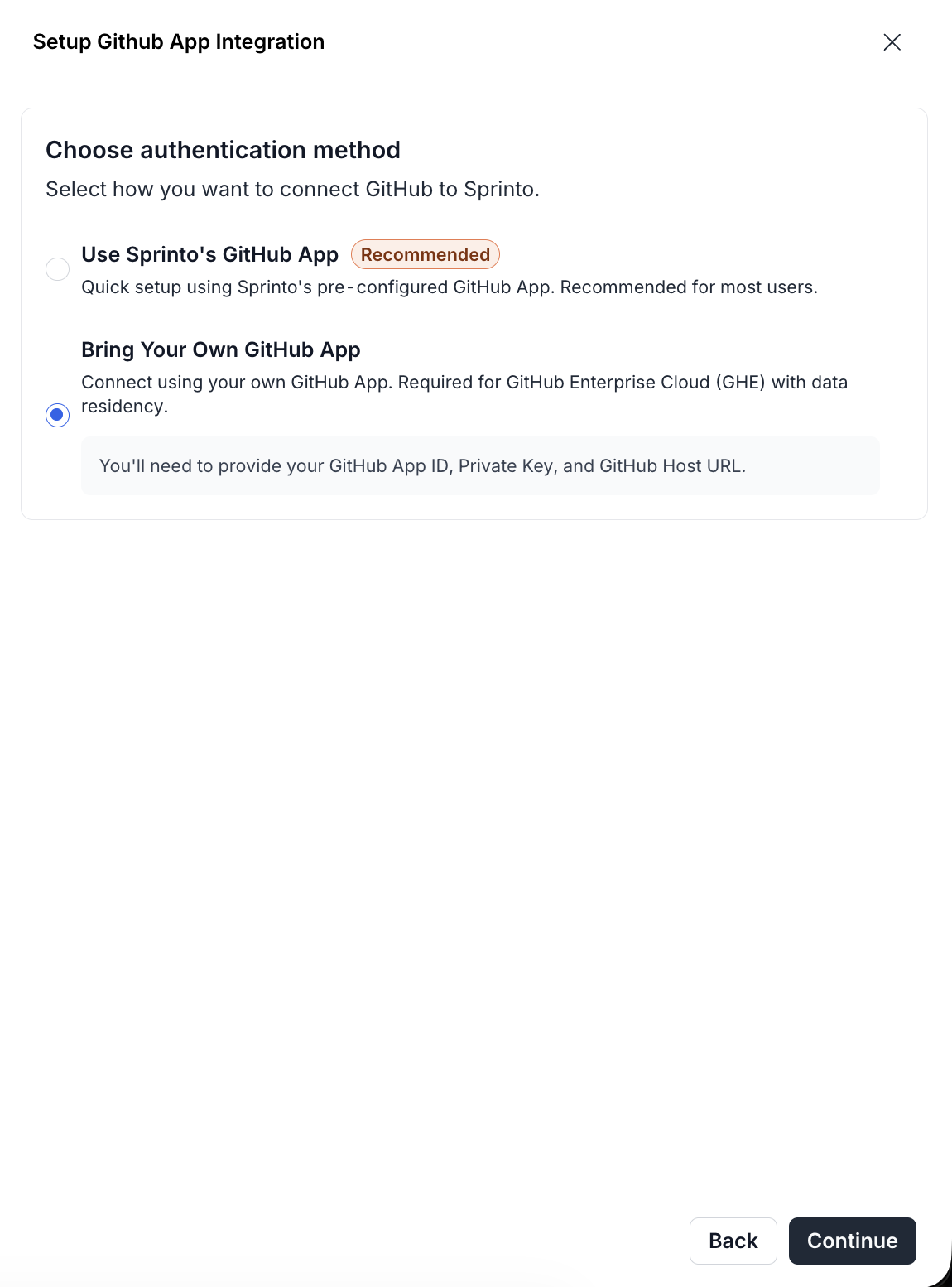 Use **Bring Your Own GitHub App** for enterprise or data residency requirements.