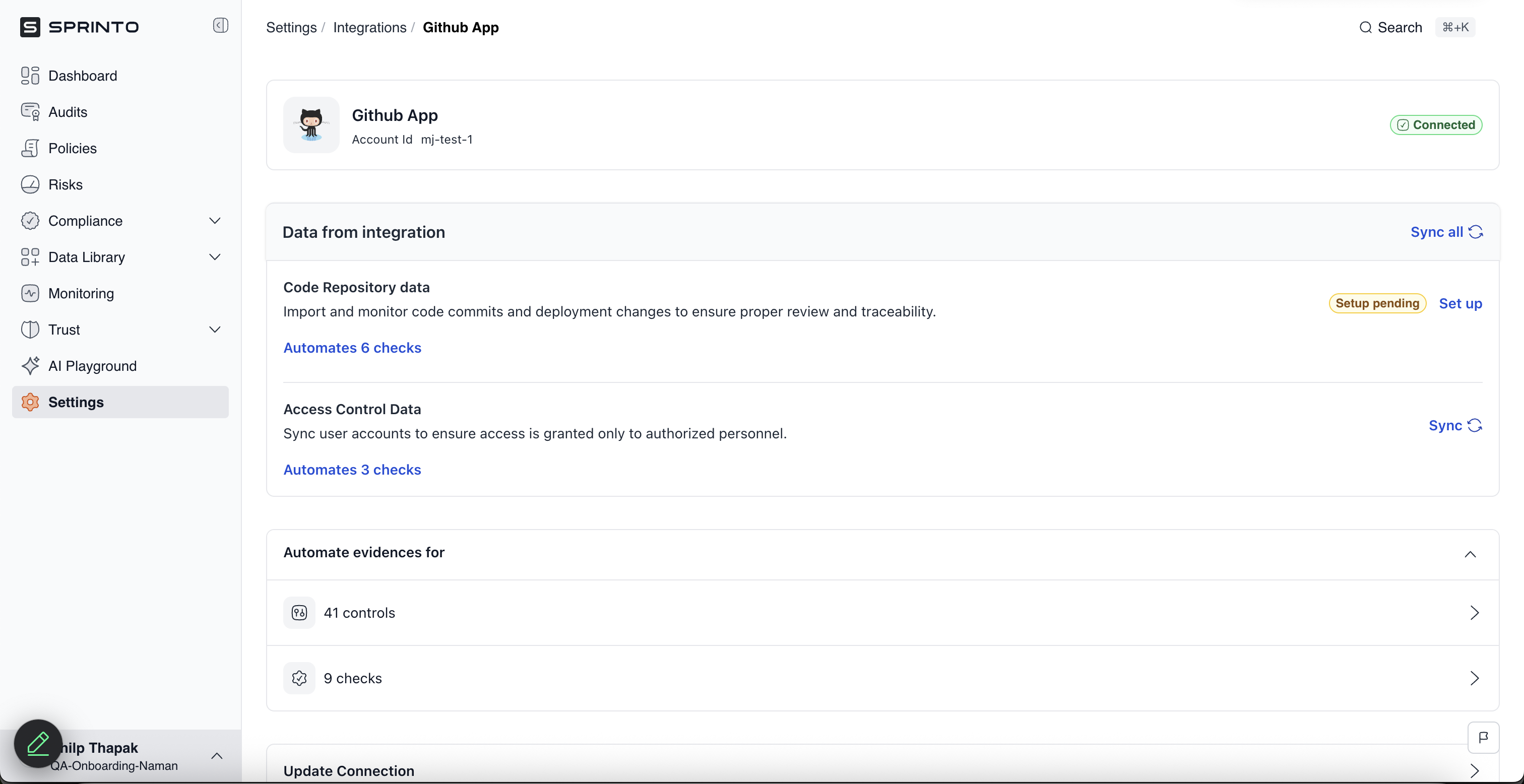 The GitHub App integration enables Sprinto to continuously monitor your GitHub organisation for repository activity, access controls, and security configurations.