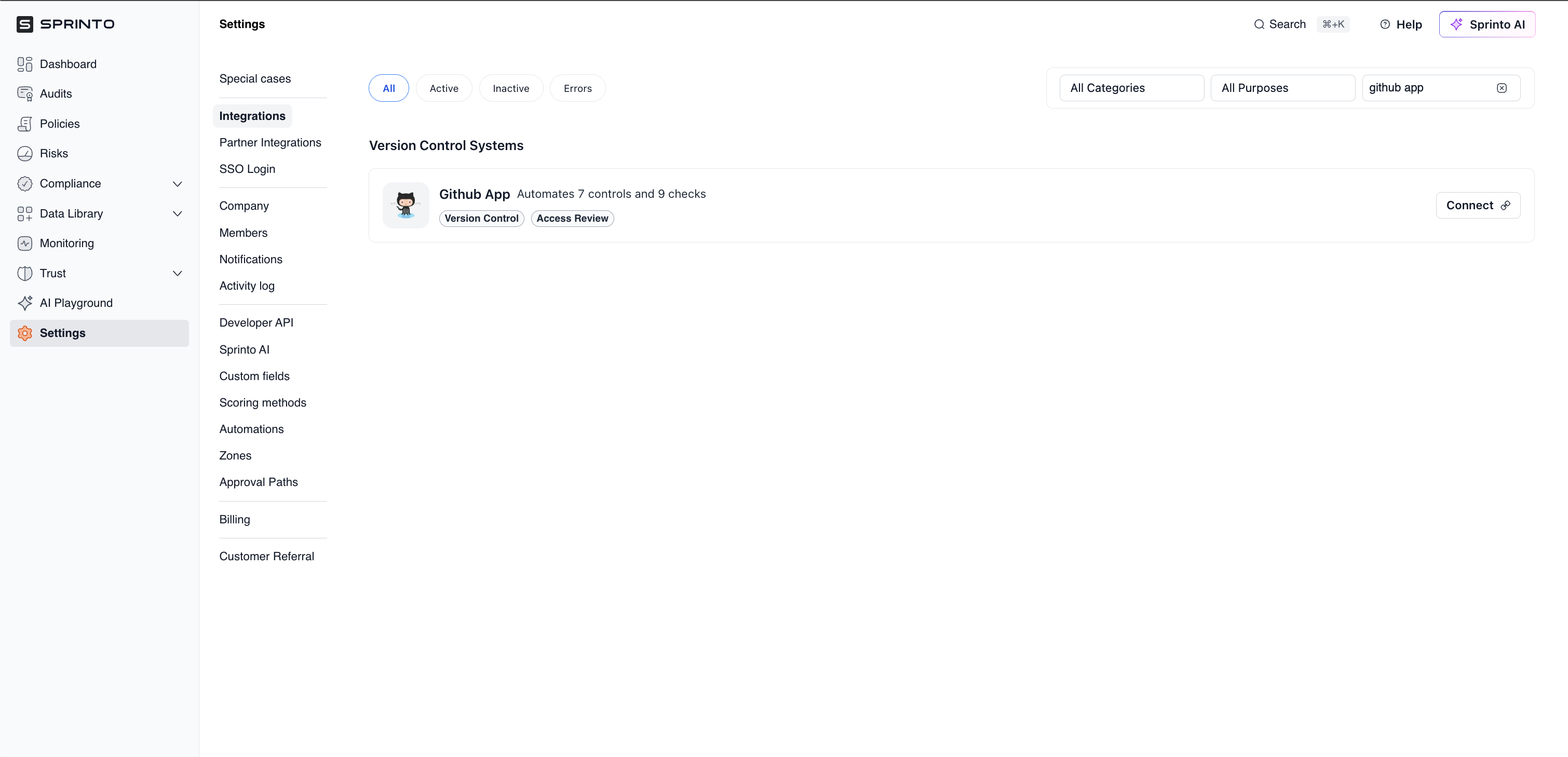 Use Sprinto’s pre-configured GitHub App for a quick setup.