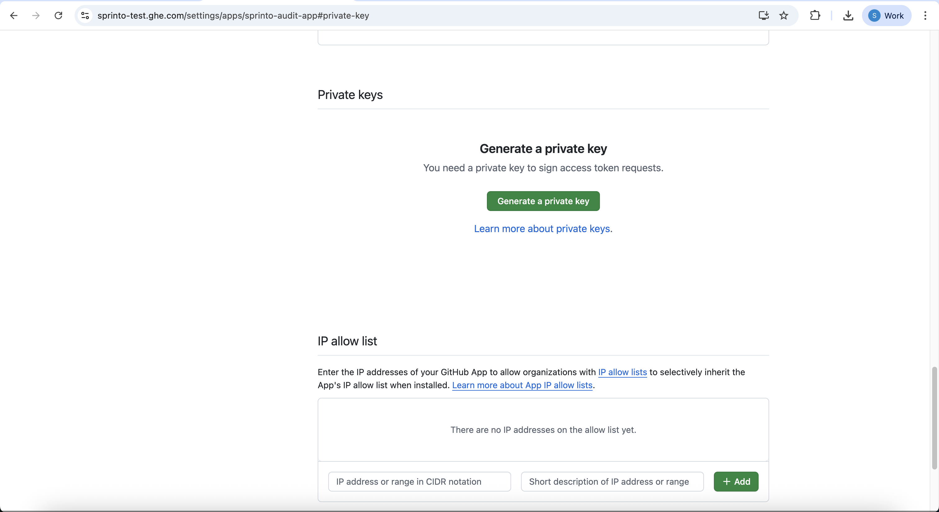 After creating your GitHub App, you must allow Sprinto’s public IP addresses if your organisation enforces IP restrictions.