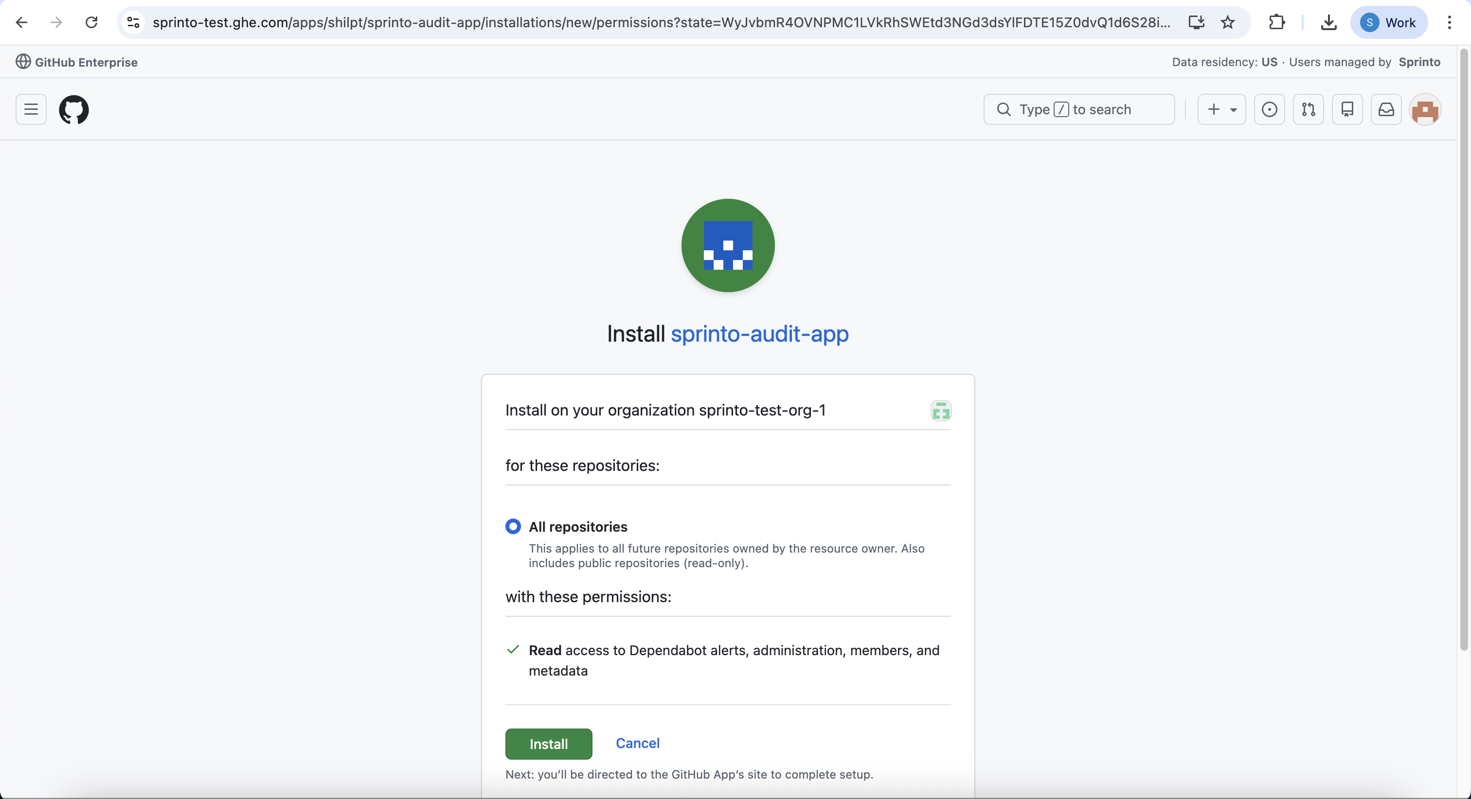 2. You install the Sprinto Audit GitHub App in your GitHub organisation.