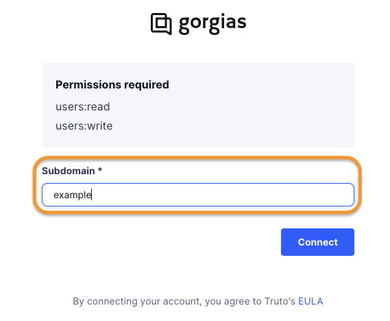 * Enter your Gorgias account subdomain in the field and click Connect. For example, if your subdomain is[ www.example.gorgias.com](http://www.example.gorgias.com/), enter the example as a subdomain in the field.