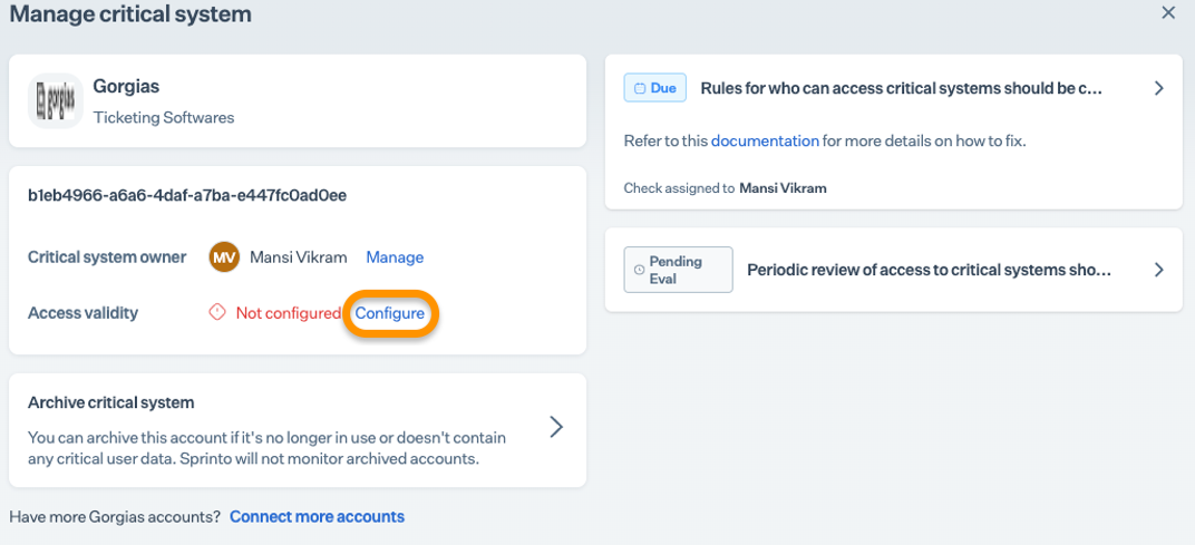After completing Step 4, allow 15 to 20 minutes for Sprinto to finish the data syncing process. Sprinto may take a few hours to evaluate the synced data and activate relevant Sprinto checks. If needed, go to Data Library> Access > Critical System to check for pending tasks next to Gorgias.