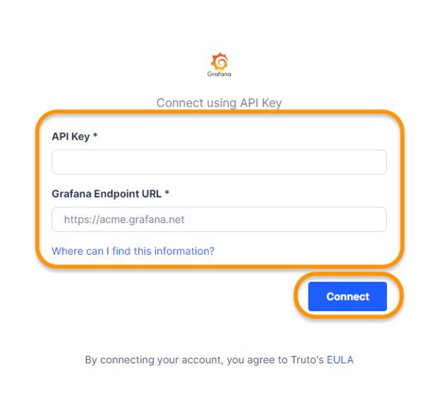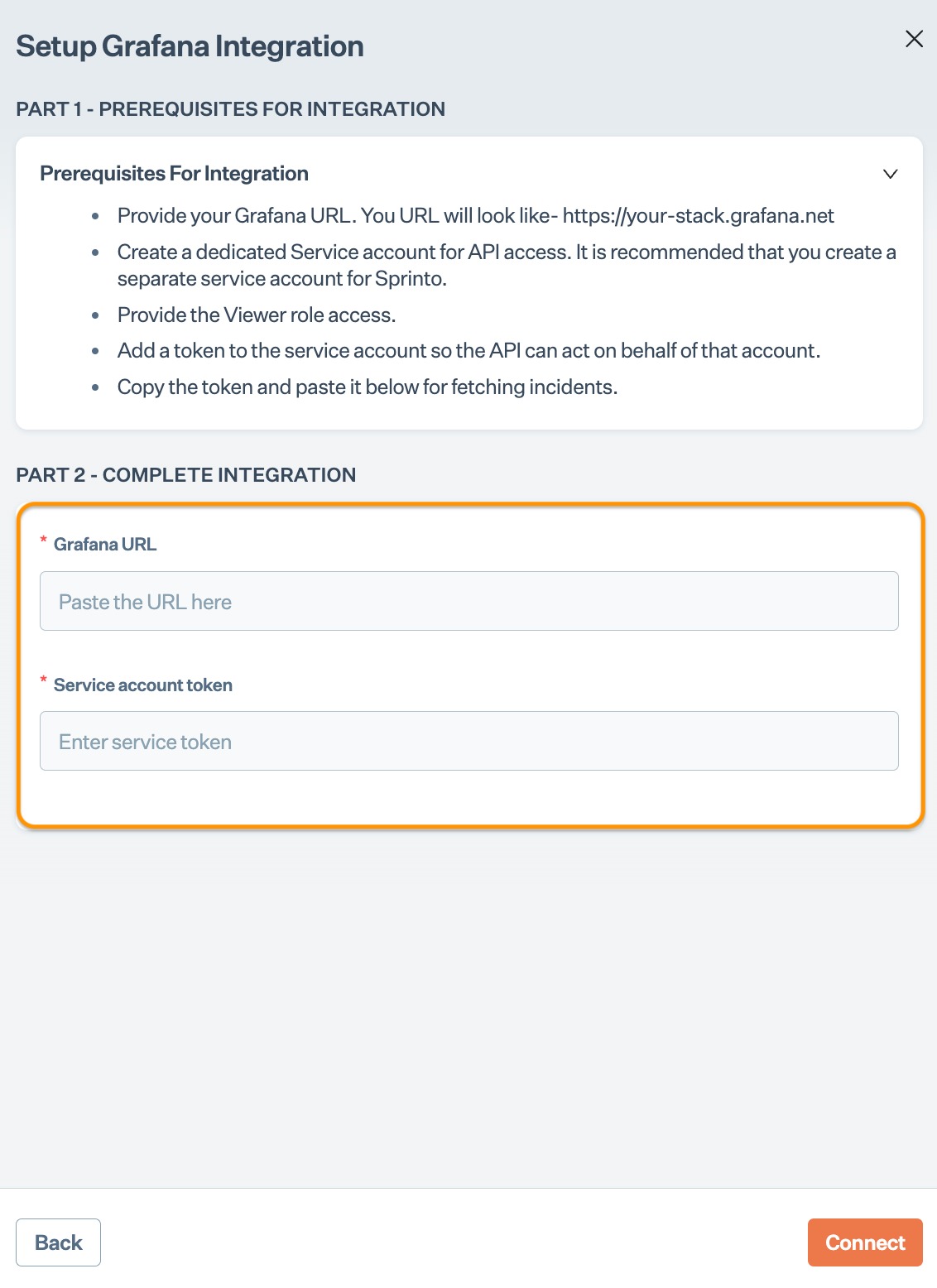 Enter the Grafana account’s URL and Token from Step 1 in the respective fields, and click Connect.
