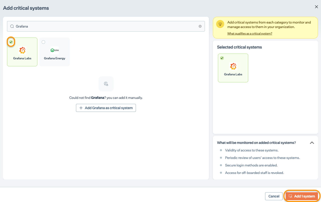 On the Sprinto app, go to Data Library > Access > Overview, and click Add Critical system.