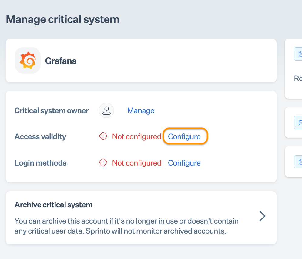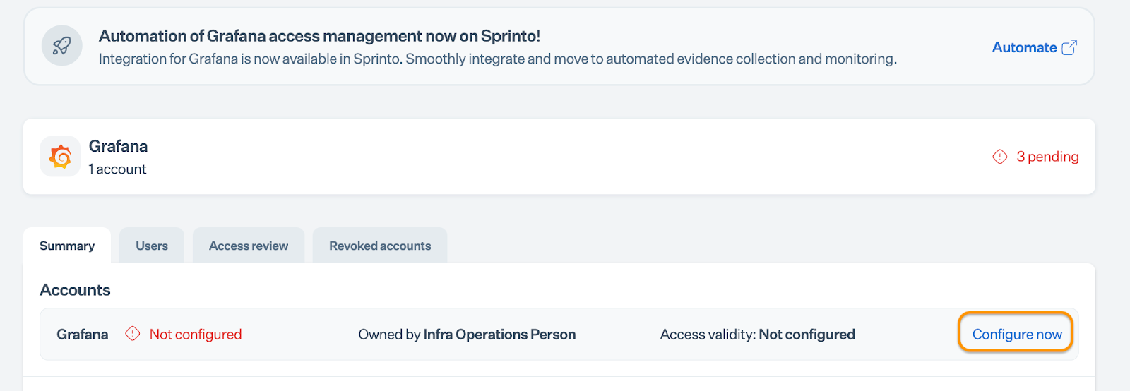 Note: Wait until Sprinto completes the data syncing process. It may take up to 24 hrs for Sprinto to compute the required Sprinto checks Upon completing the Grafana account configuration for your desired use case on Sprinto, Sprinto starts syncing data from Grafana to compute the compliance posture of the integrated Grafana account. If any of the configurations do not align with compliance requirements, Sprinto highlights them with the help of Sprinto checks.