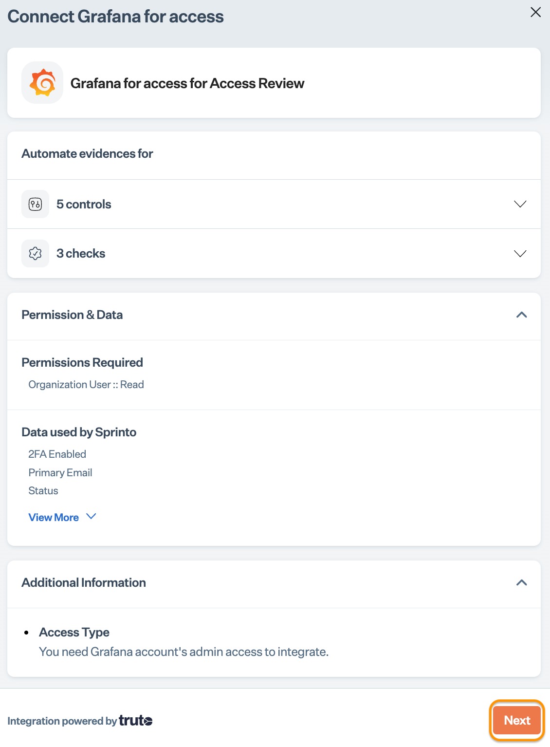 Grafana’s integration with Sprinto allows Sprinto to read critical information, such as user account details, and open incident tickets on your Grafana account. These retrieved details help Sprinto compute the account’s compliance posture and missing configurations. Sprinto activates the Sprinto checks for any such missing configuration, helps you get aligned with compliance requirements, and improves your account’s data security.