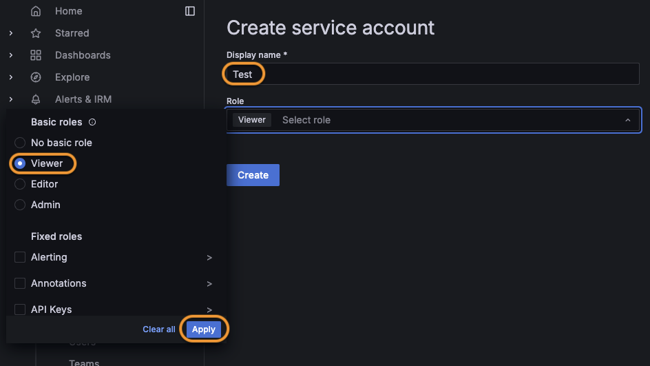 Create a new service account and generate a token on Grafana to integrate with Sprinto.