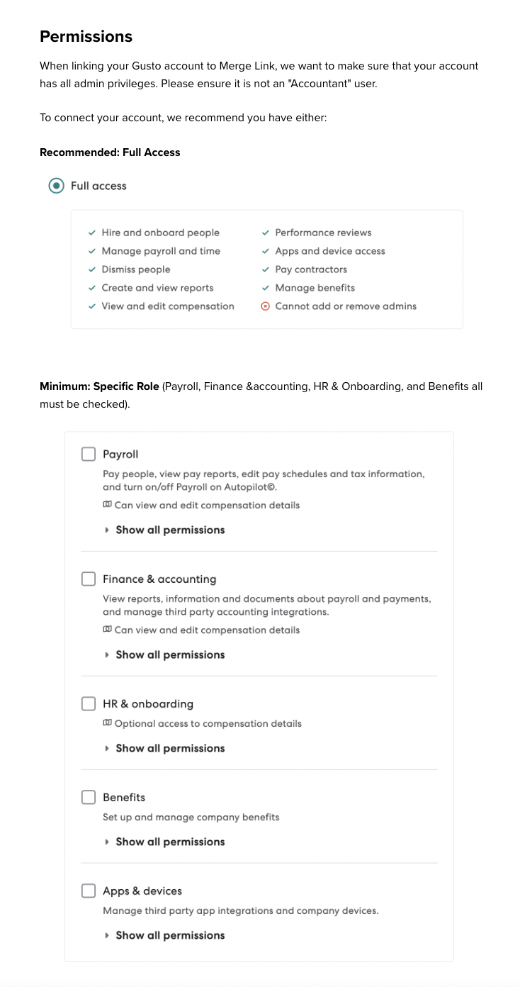 According to Merge, the following Gusto permissions are the minimum required for Sprinto to sync employee data fields equivalent to Deel: