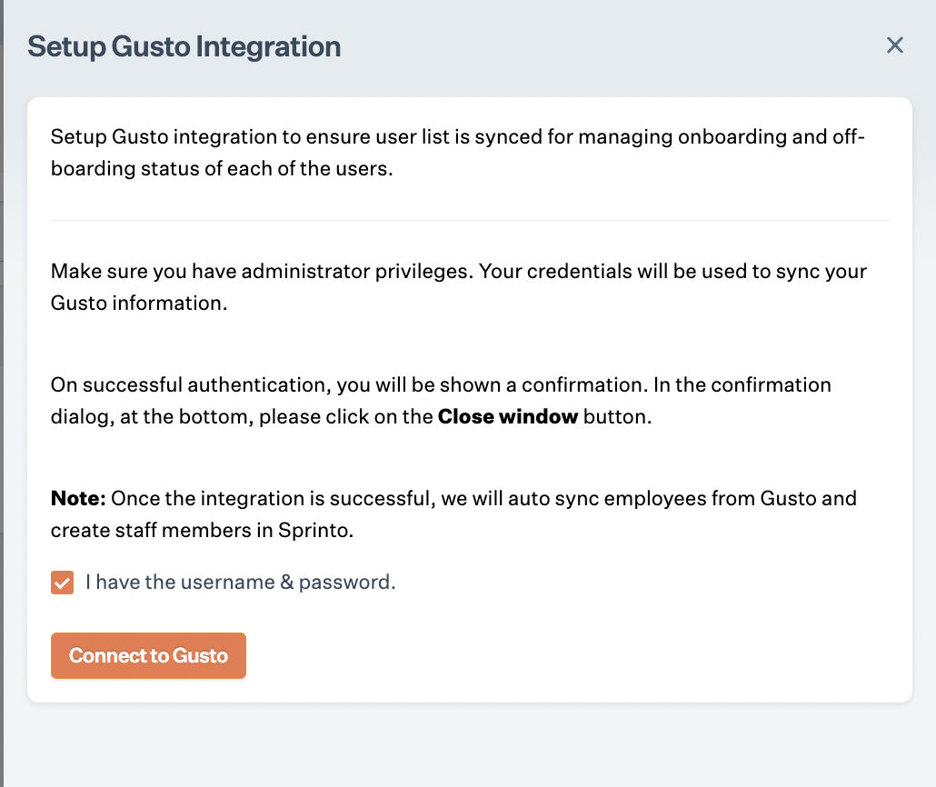 A pop-up window will prompt you to enter your Gusto admin credentials.