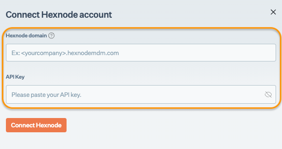* Enter your Hexnode domain and API Key copied from Step 1, and click Connect Hexnode.<br>