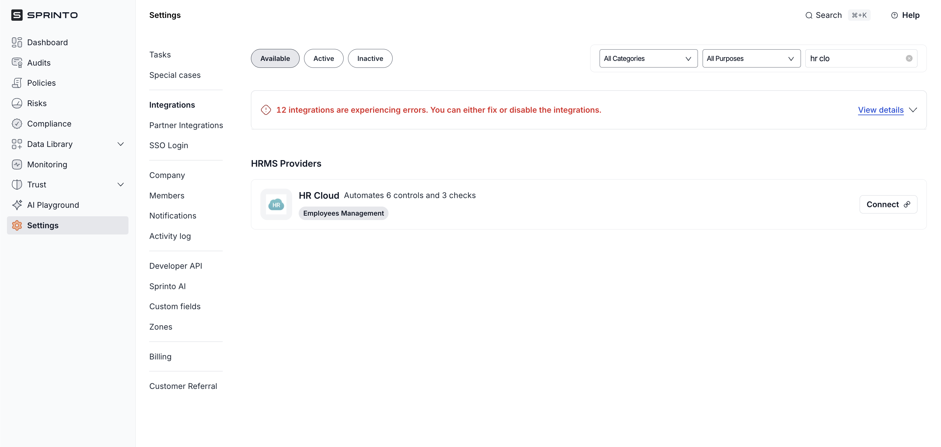 Go to Settings > Integrations > Integrations, then click Connect next to HR Cloud.