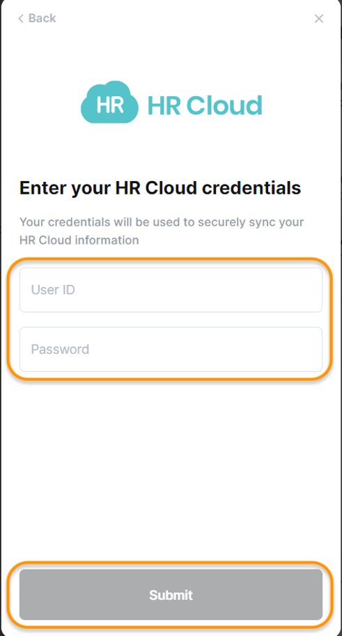 On HR Cloud window, enter your HR Cloud account credentials, then click Submit. Note: This completes integrating the HR Cloud account on Sprinto. Follow step 2 to configure your HR Cloud account.