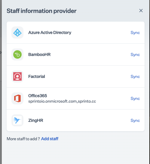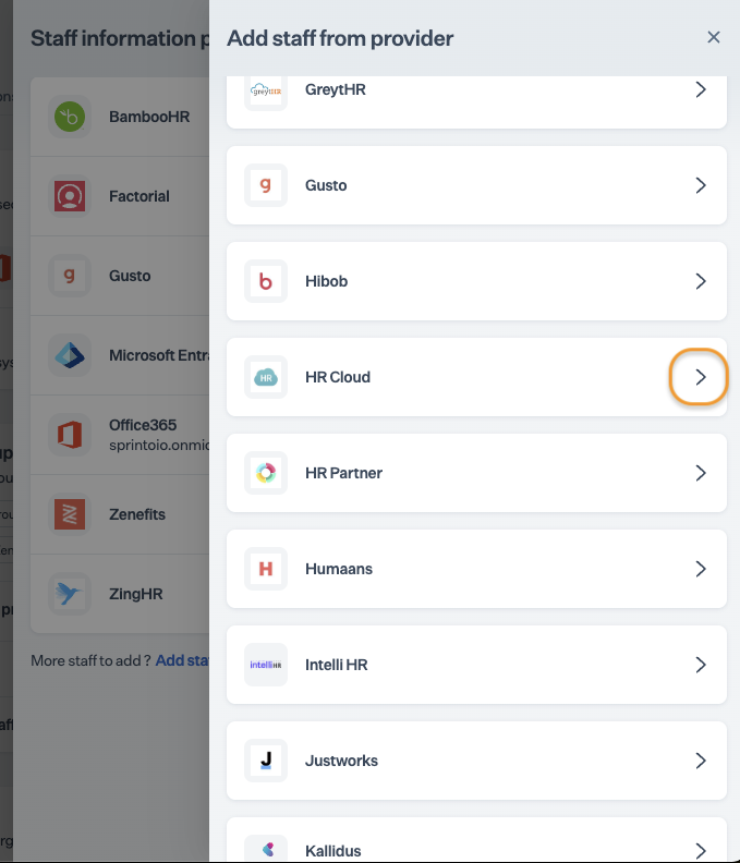 On Add staff member page, select Add staff from HRMS, then click the details button next to HR Cloud.