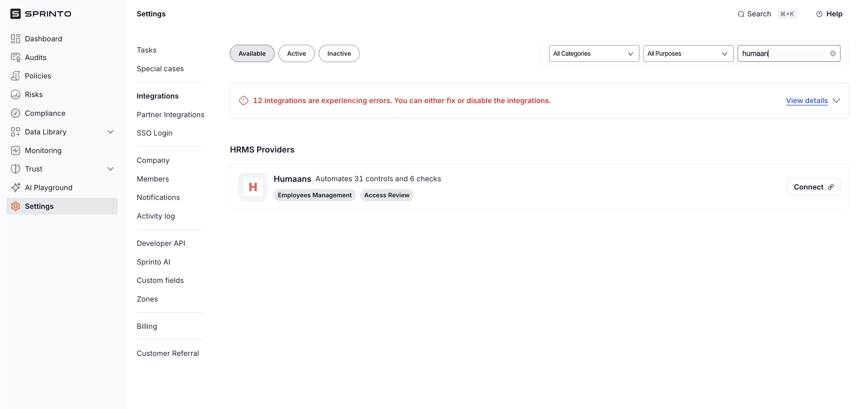 The following guide helps you integrate and configure Humaans with Sprinto for people and user access management. Based on your use case, you can follow the applicable procedure.