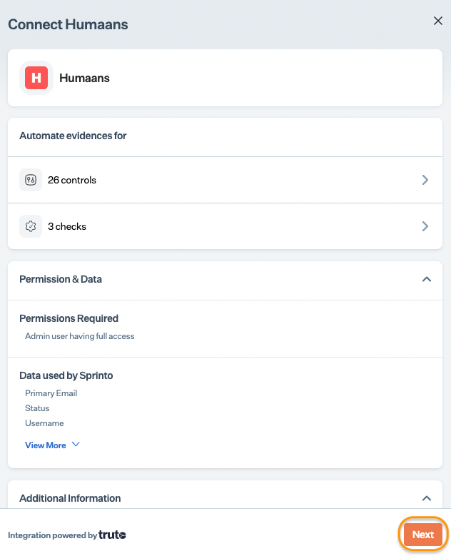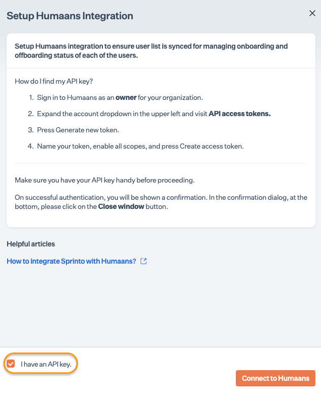 Ensure you have administrator access on the Humaans account to grant necessary permissions to Sprinto.