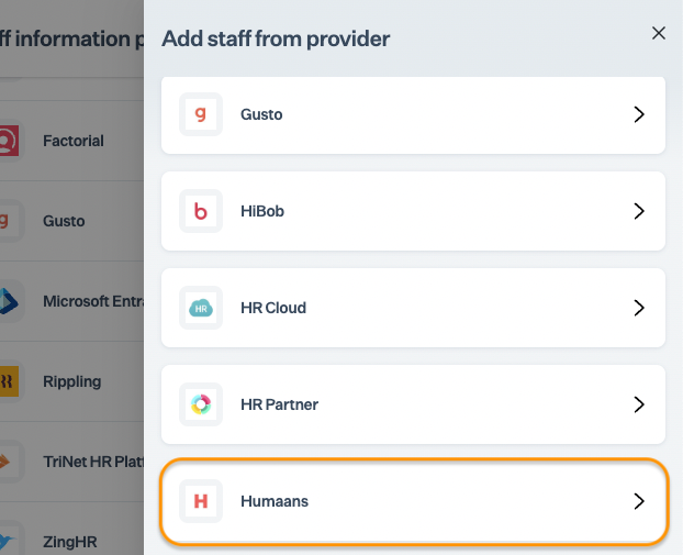On the Add staff member page, select Add staff from HRMS, then click the details button next to Humaans.