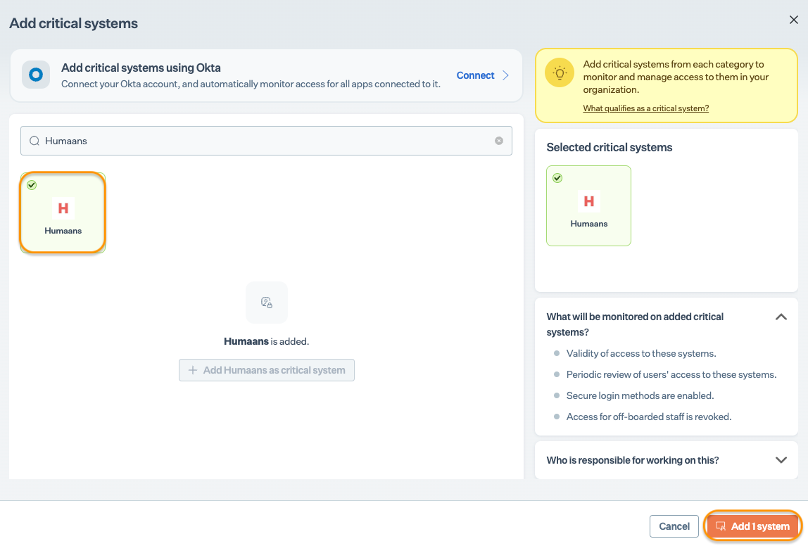 Select Humaans from the critical system library, then click Add Systems. “Connected” is highlighted next to Humaans if integration was built successfully in the previous step.
