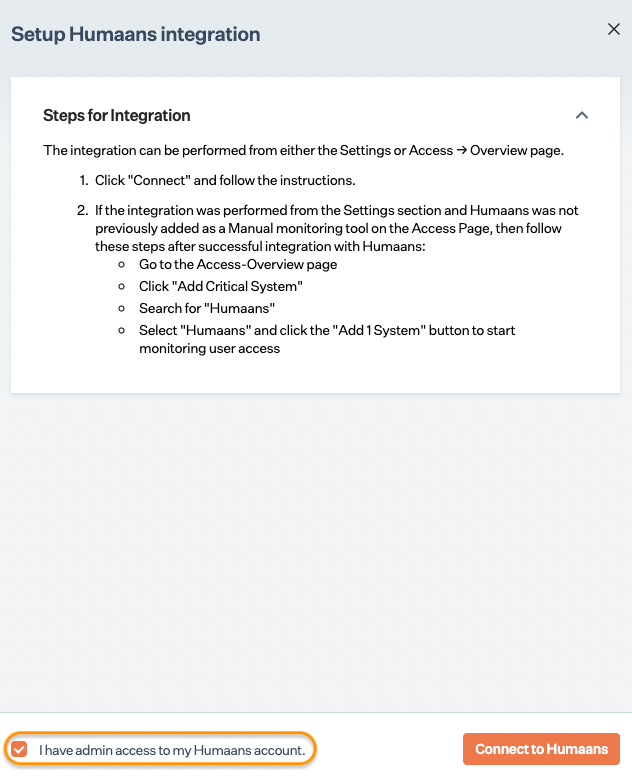 Select the acknowledgment checkbox, then click Connect to Humaans. Note: Ensure you have the pop-up window enabled on your browser.