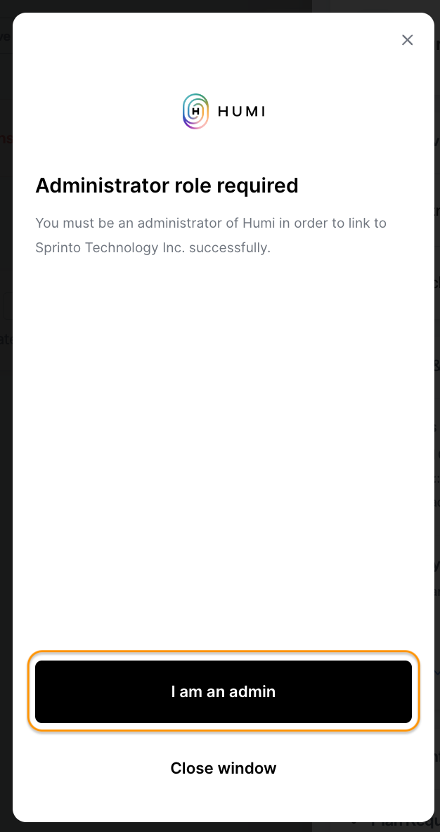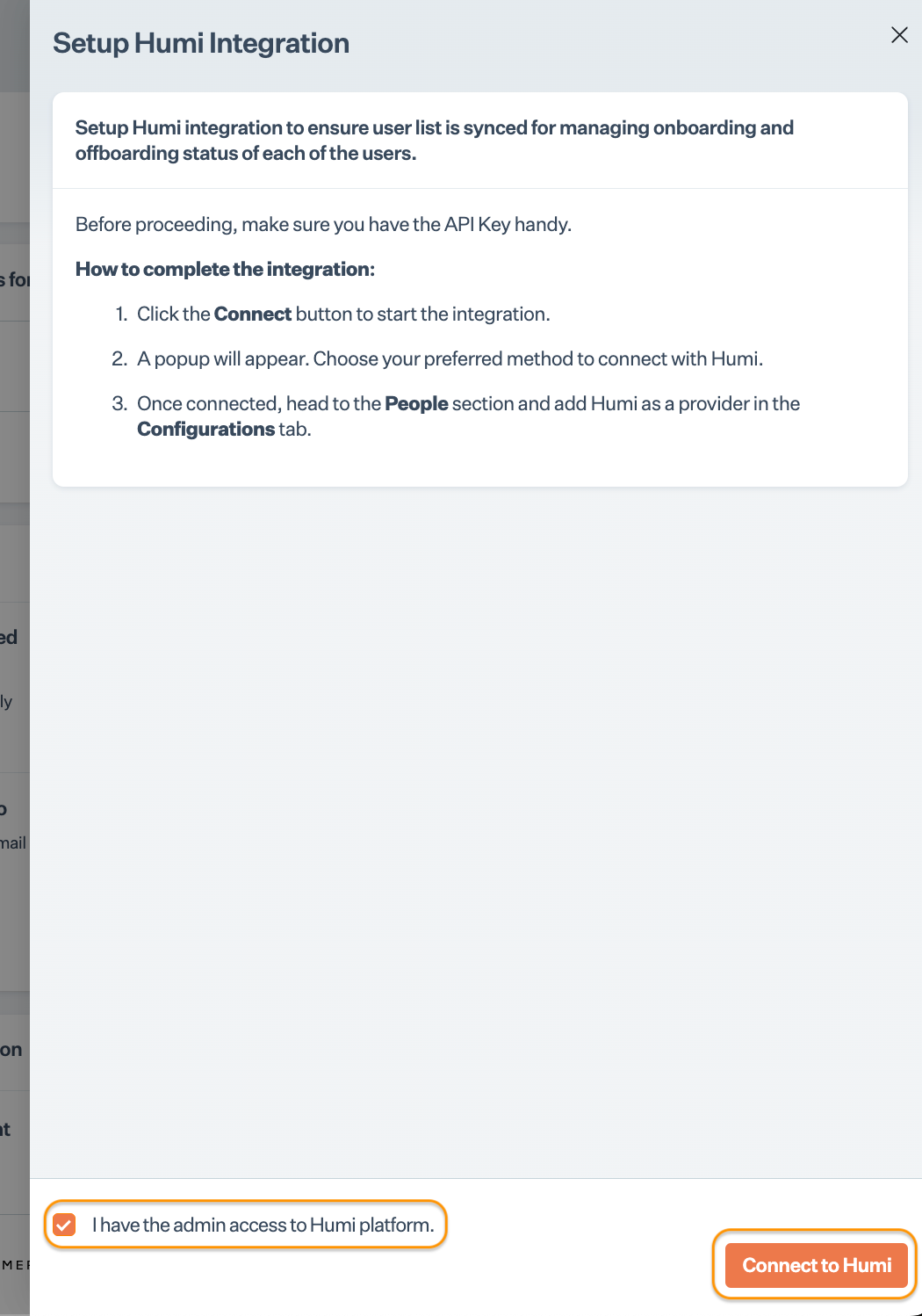 Select the acknowledgment checkbox, and click Connect to Humi. Note: Ensure the pop-up window is enabled on your browser.