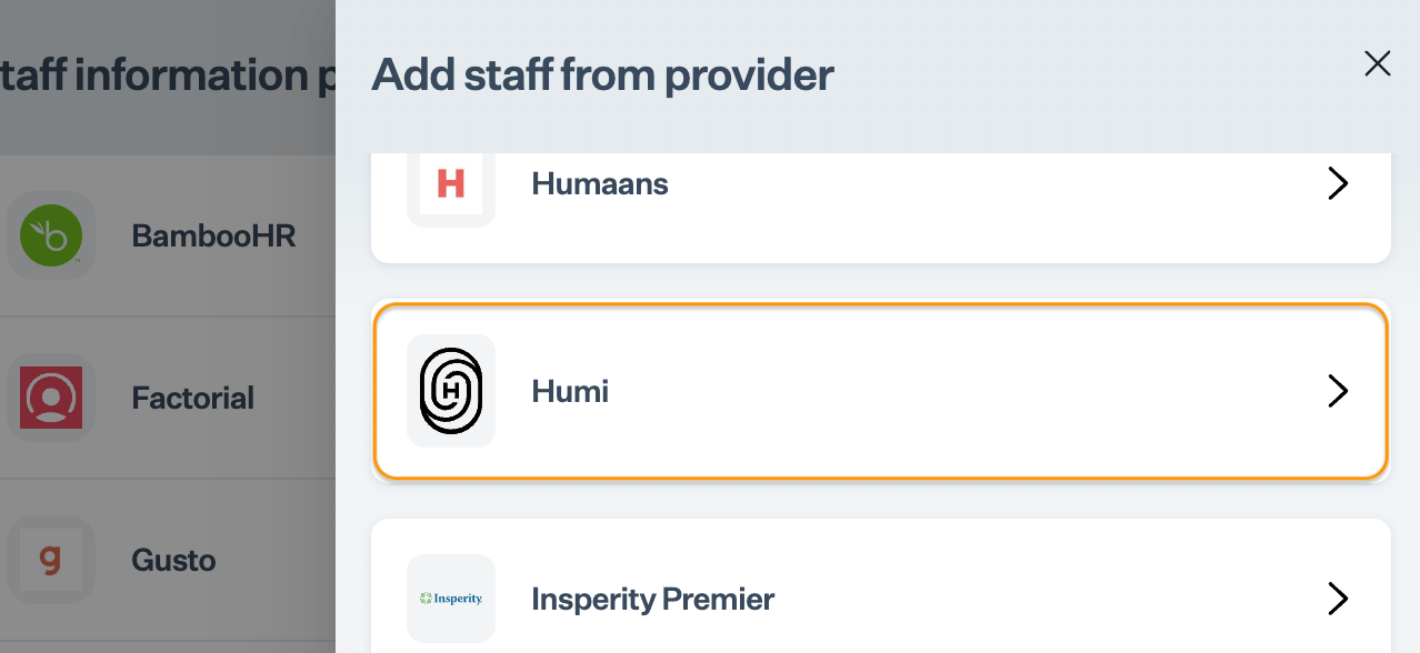 Select Humi from the list of providers. Note: “Connected” is highlighted for the integrated services.