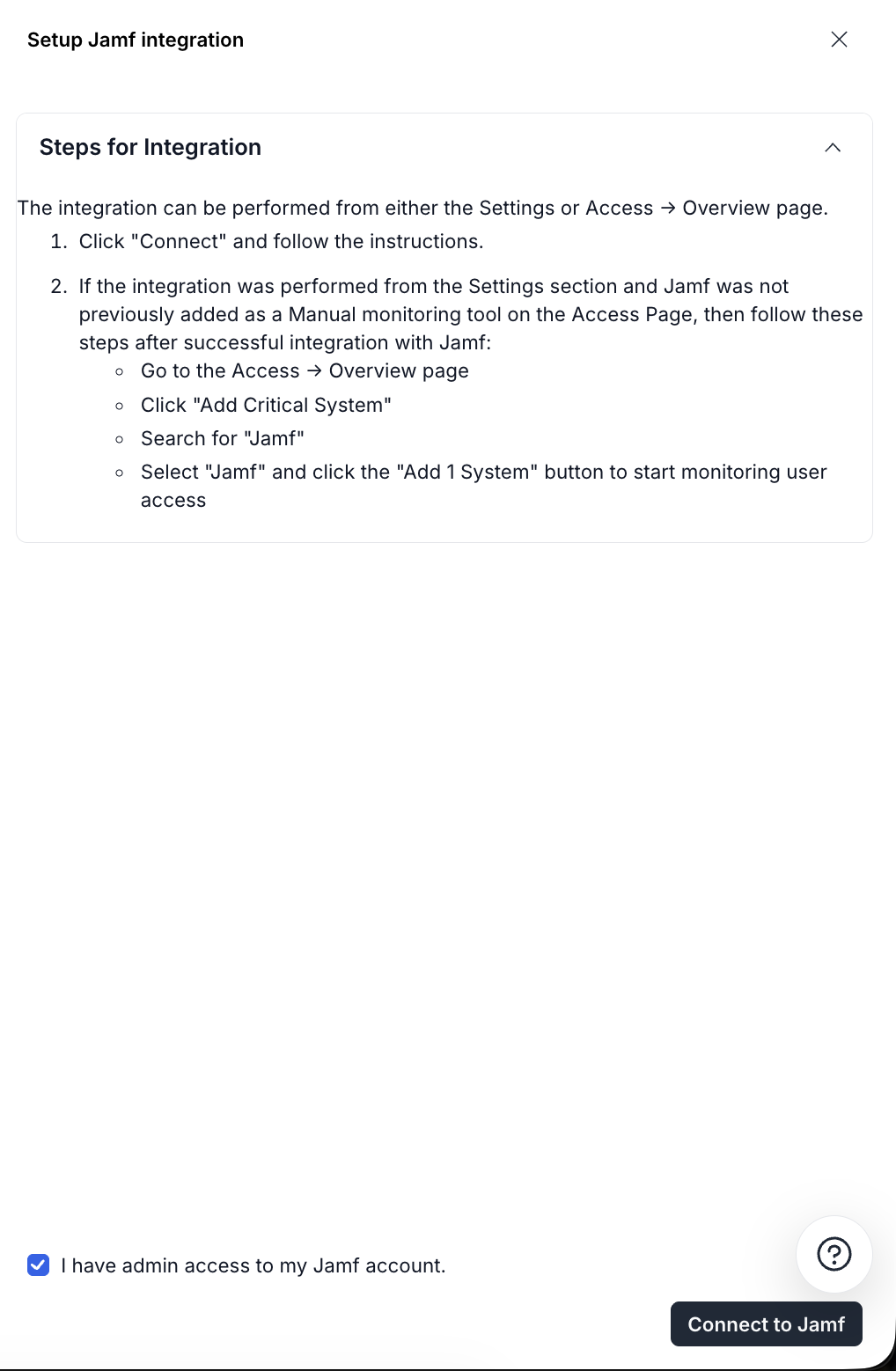 3. Select the **I have admin access to my Jamf account** checkbox.