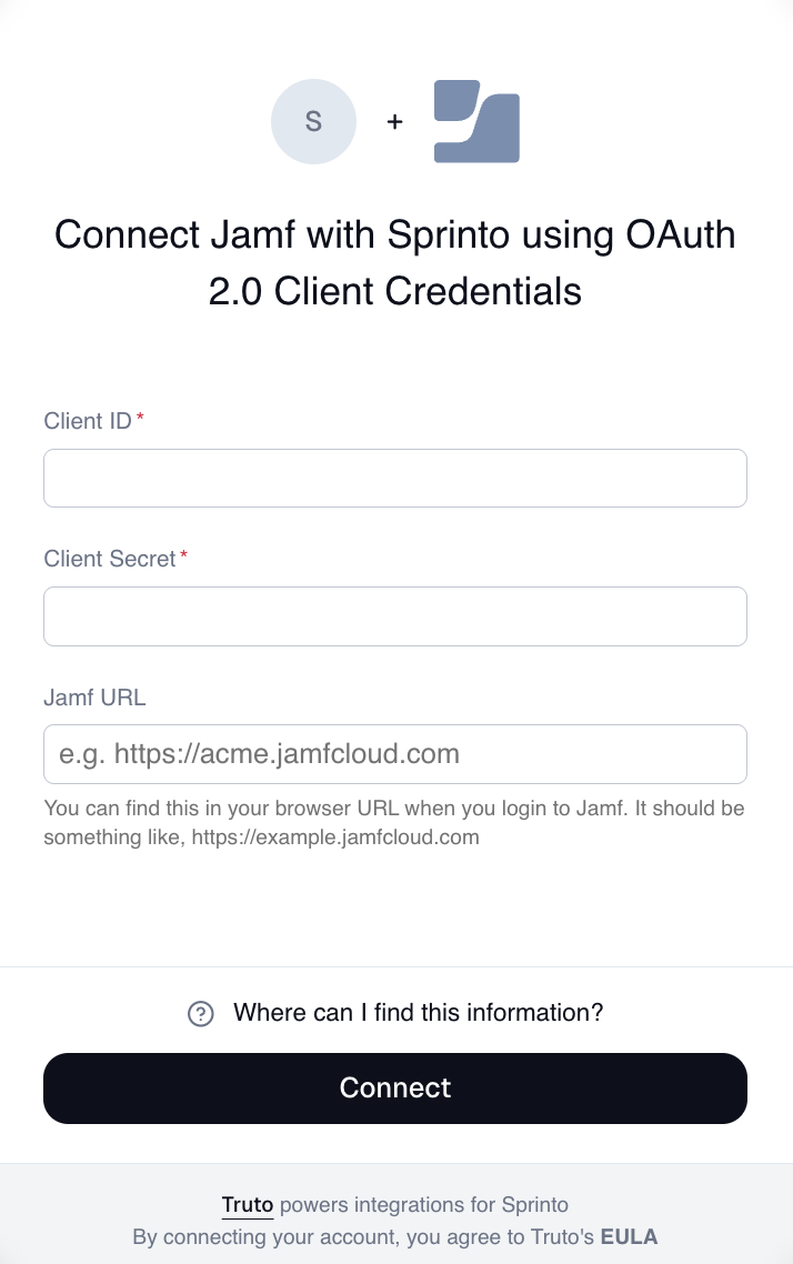To retrieve your Jamf OAuth credentials and connection information, refer to the [official setup instructions](https://truto.notion.site/Jamf-29bac512f5a5804fae55f307e4f92e74).