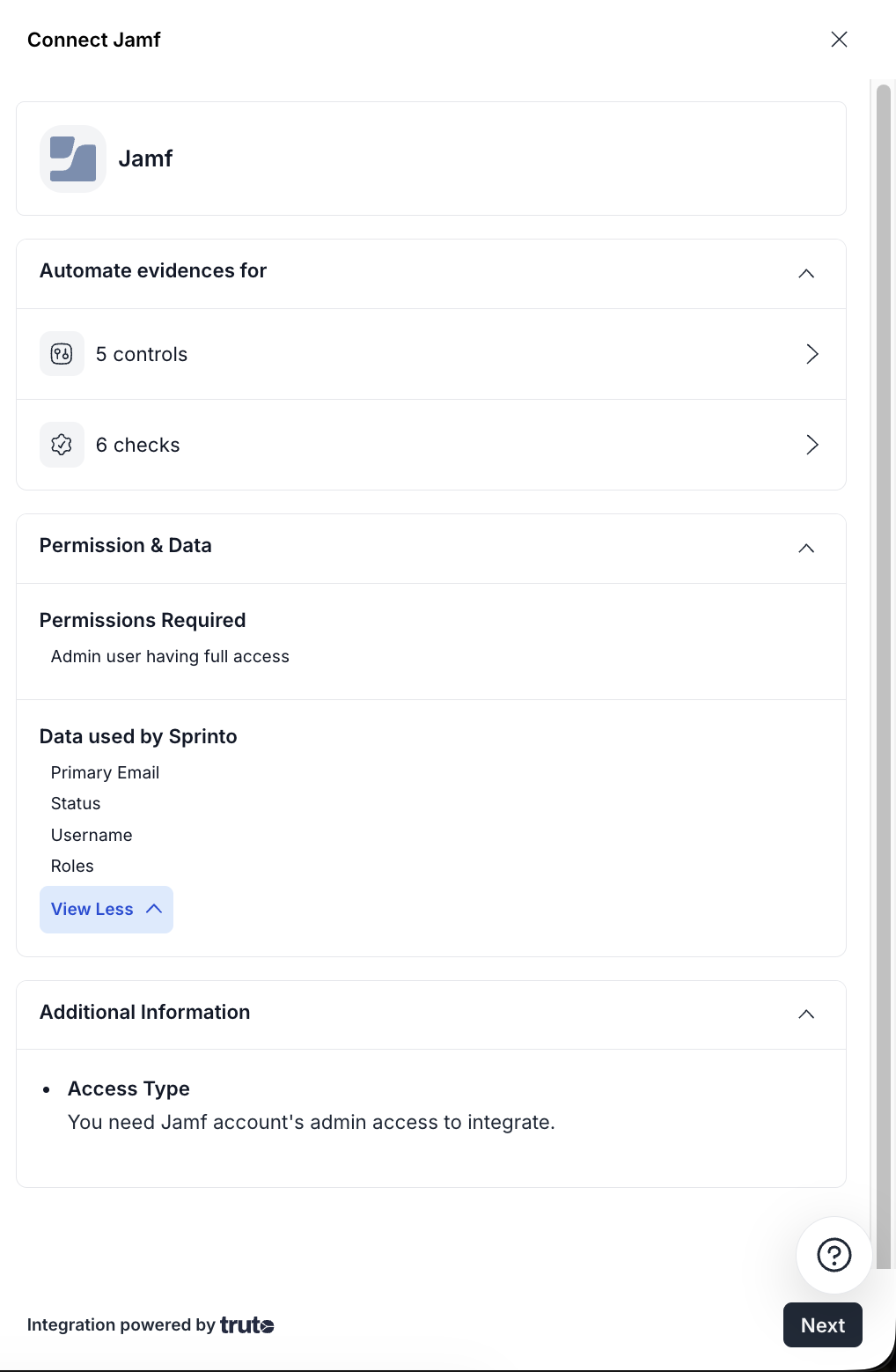 Sprinto integrates with Jamf Access Review using OAuth 2.0 authentication through Truto. Once connected, Sprinto automatically syncs Jamf user access information to support access review controls and compliance monitoring.