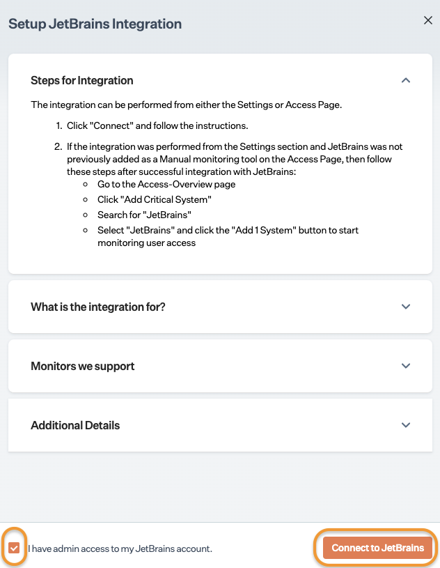 Ensure you have "Admin" access to the JetBrains account intended for integration.