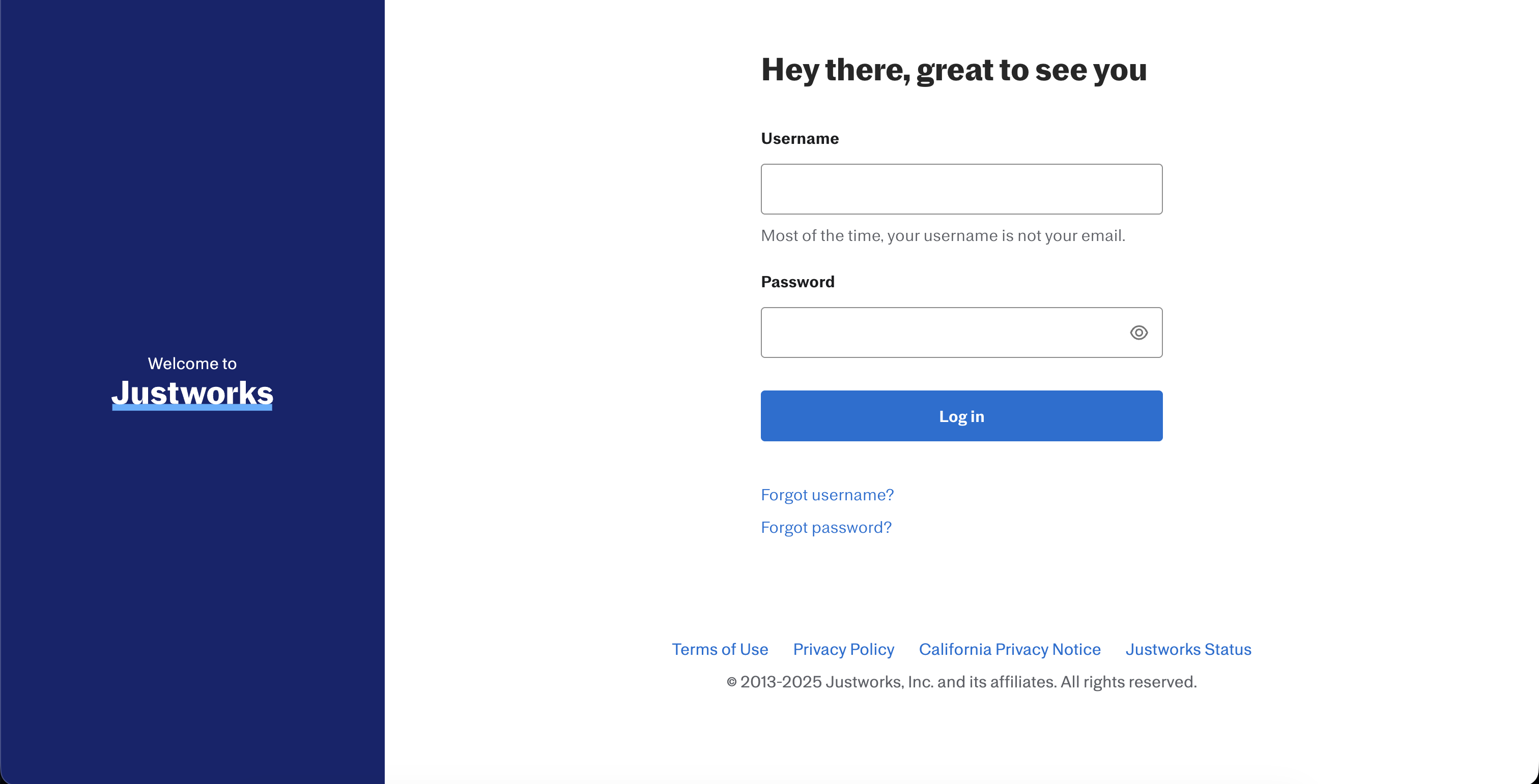Once you are redirected to the Justworks website, enter your administrator email address and password.