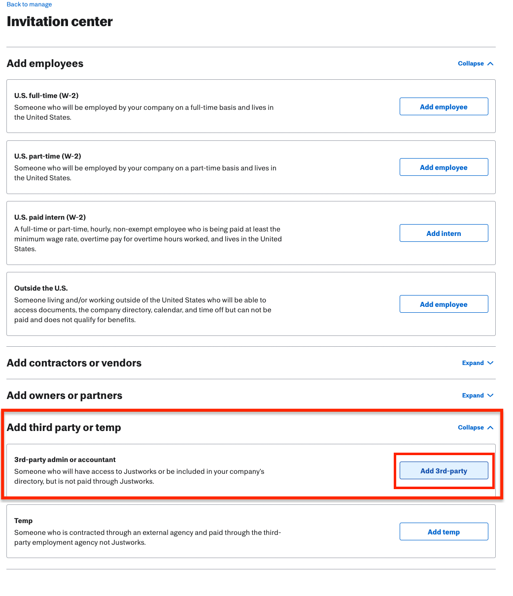 Scroll down to Add third party or temp option, then expand the option and click Add 3rd-party next to the 3rd-party admin or accountant option.