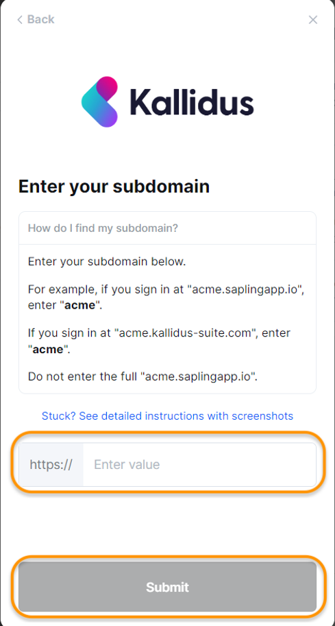 * On Kallidus window, enter the Kallidus account subdomain you copied from Step 1.