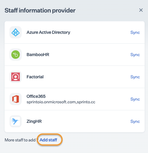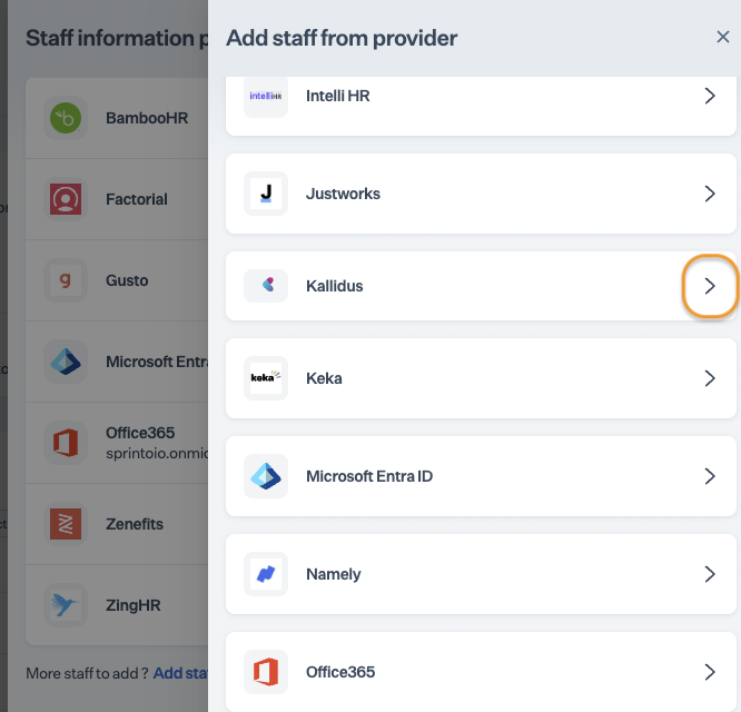 * On Add staff member page, select Add staff from HRMS, then click the details button next to Kallidus.