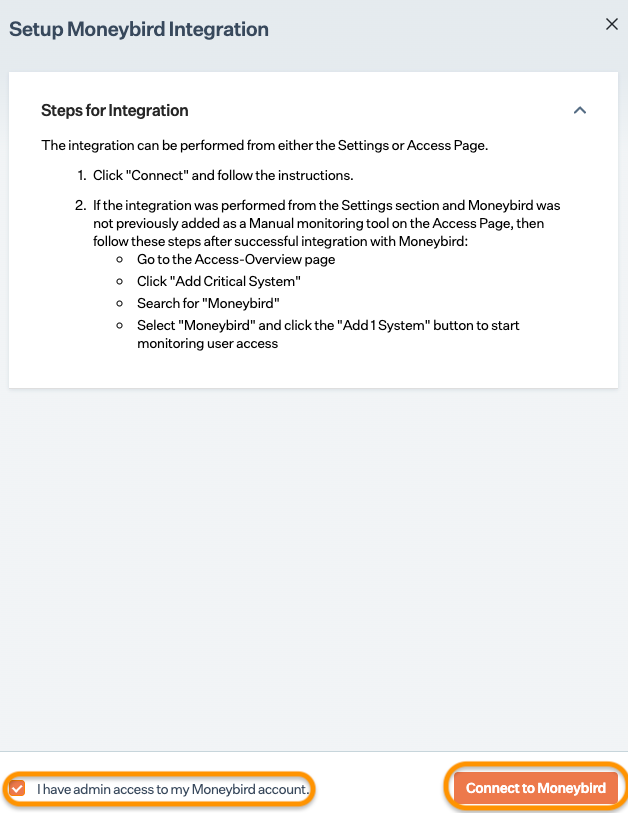 Ensure you have “Admin” access on the Moneybird account you want to integrate.