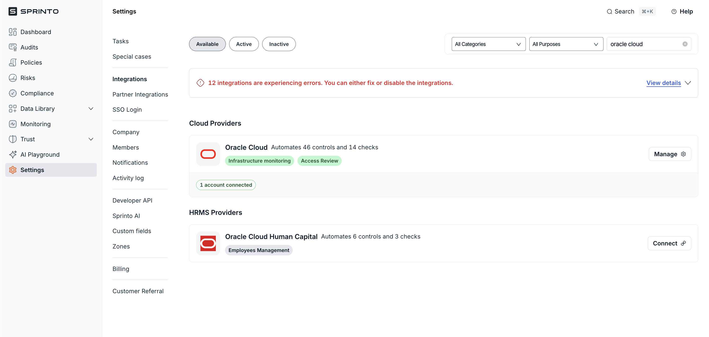 6. Add Oracle Cloud as an Infrastructure service provider on Sprinto.