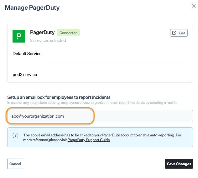 If required, you can configure an email address for your employees to report incidents. For email-based incident reporting, you need to configure the email address on your PagerDuty account and enter the same email address in the field below. Refer to the PagerDuty documentation for detailed instructions on email integration.