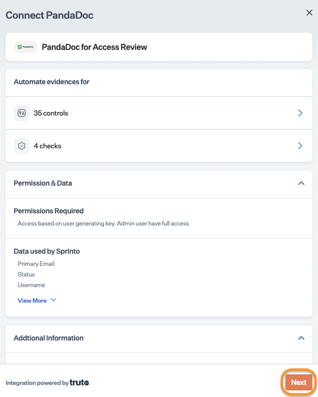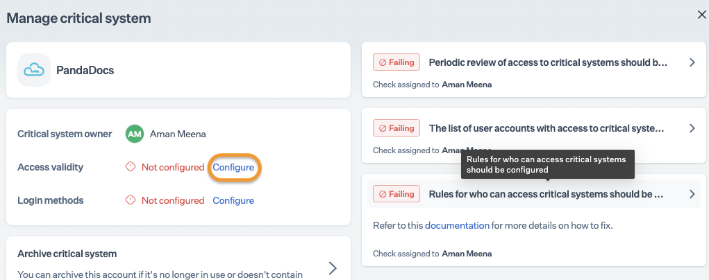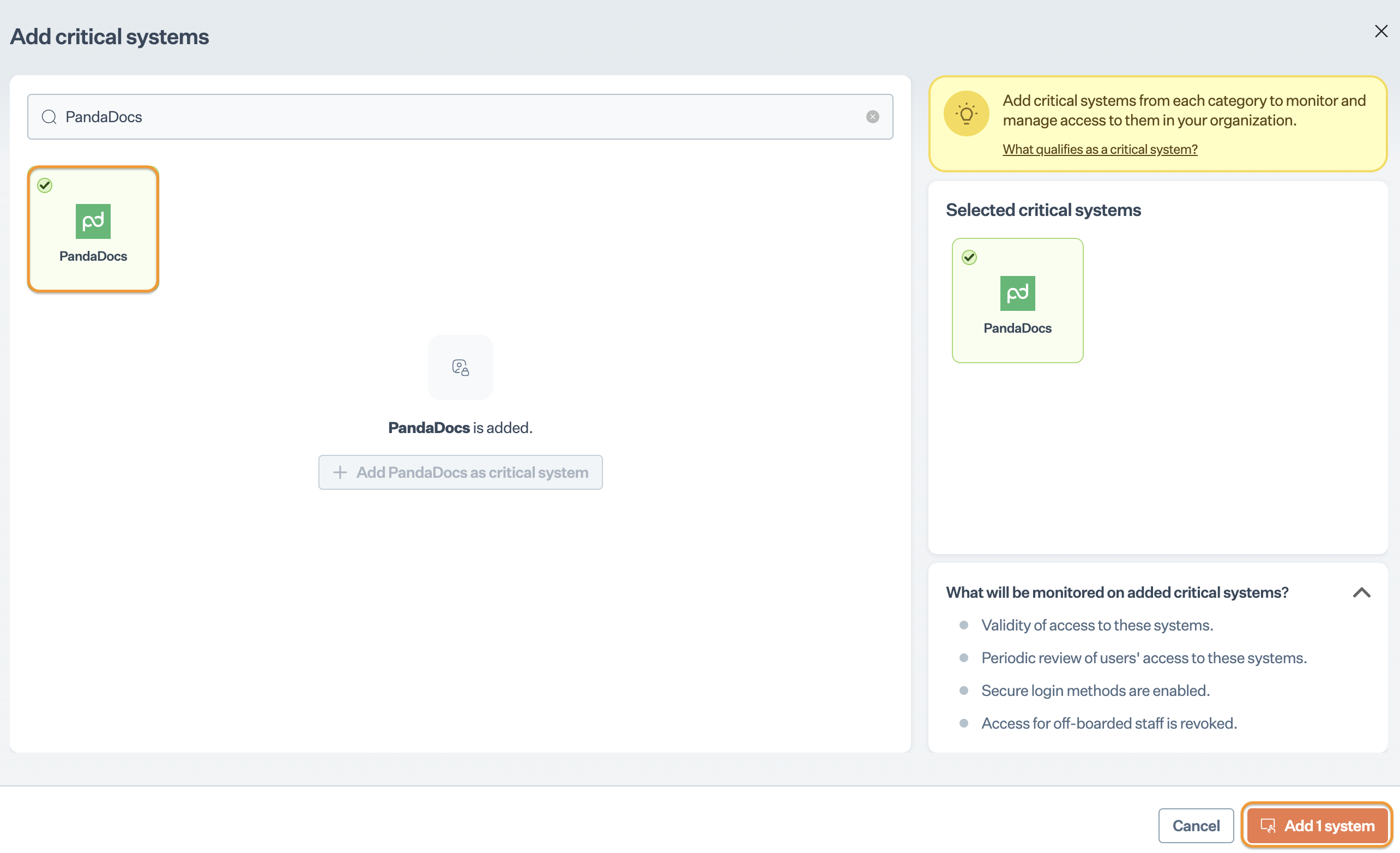 After completing Step 4, allow 15 to 20 minutes for Sprinto to finish the data syncing process. Sprinto may take a few hours to evaluate the synced data and activate relevant Sprinto checks. If needed, go to Data Library > Access > Critical System to check for pending tasks next to PandaDocs.